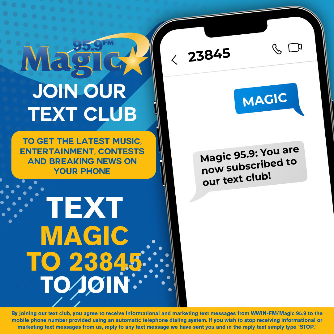 By joining text club, you agree to receive informational and marketing text messages from WWIN FM / Magic 95.9 to the mobile phone number provided using an automatic telephone dialing system. Agreement is not required as a condition of purchasing any property, goods or services. Message and data rates may apply. Maximum of five Text Club messages per week. To cancel Text Club, reply STOP to Text Club message. Reply HELP for more information. For complete Text Club terms and conditions and esign disclosures, click HERE.